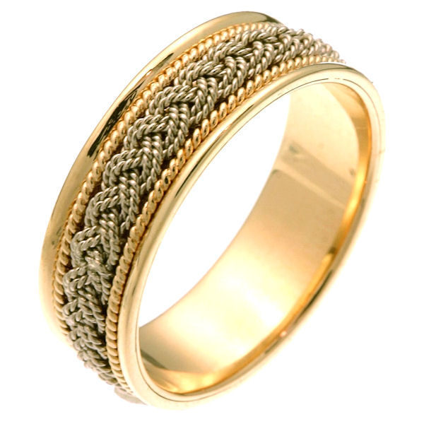 Platinum and 18 kt hand made braided wedding band. The ring is about 7.0 mm wide and comfort fit. There is one hand crafted braid in the center. On each side of the braid is one hand made rope. The whole ring is polished. Different finishes may be selected or specified.