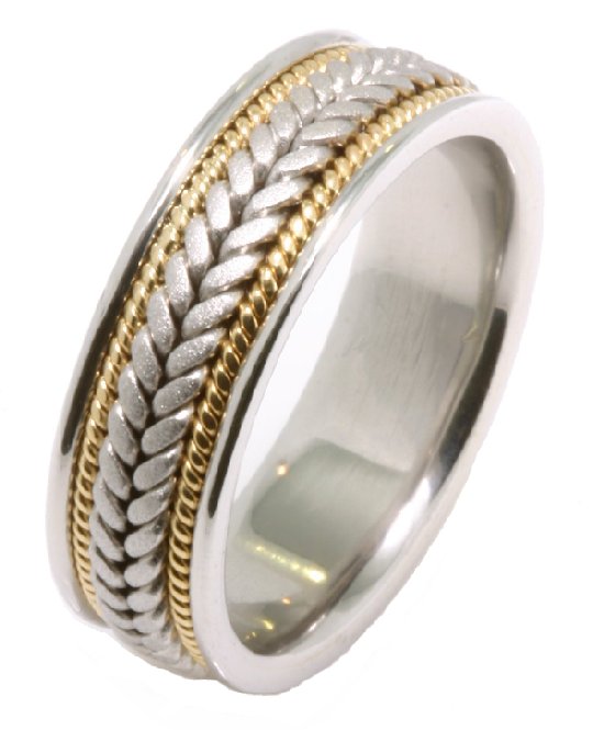 Hand crafted, 14kt two-tone gold comfort fit band. Two channels of 14 kt yellow gold twisted wires completes the ring. The center of the ring is matte and the outer edges are polished. Different finishes may be selected or specified.