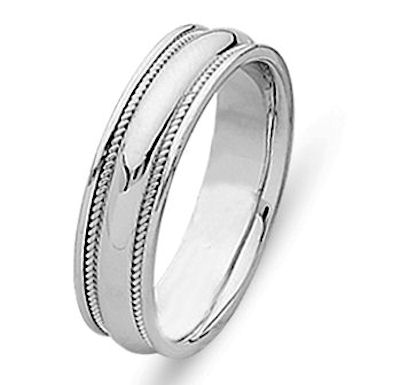 Hand crafted, 14kt white gold comfort fit band. Two channels of 14 kt white gold twisted wires completes the ring. The whole ring is polished. Different finishes may be selected or specified.