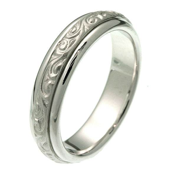18 kt white gold 5.5 mm wide comfort fit wedding band. The ring has beautiful hand carved motifs in the center that is a matte finish and the edges are polished. It is 5.5 mm wide and comfort fit. Different finishes may be selected or specified.