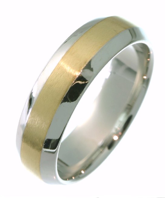 Hand crafted, platinum and 18 kt yellow gold, 6.0 mm wide, comfort fit band. The center portion has a matte finish and the edges are polished. Different finishes may be selected or specified.