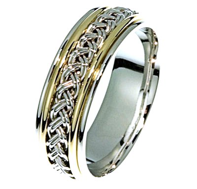 Hand crafted, platinum and 18 kt yellow gold 6.5 mm wide comfort fit band. The twisted braid is platinum enclosed with two 18kt yellow gold wires with the rest of the band platinum. The whole ring has a high polish finish. Different finishes may be selected or specified.
