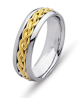 Hand crafted, 18K white and yellow gold comfort fit, 6.5 mm wide wedding ring. Colors may be reversed. There is a hand made braid in the center. The whole ring is polished. Different finishes may be selected or specified.