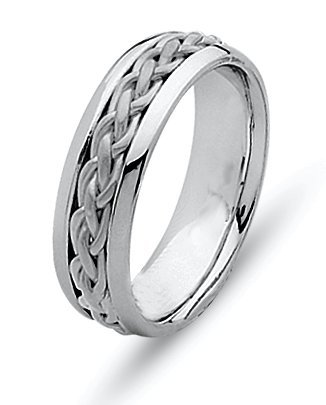 Hand crafted, platinum, comfort fit, 6.5 mm wide wedding ring. There is a hand made braid in the center. The whole ring is polished. Different finishes may be selected or specified.