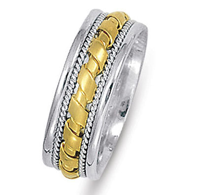 Hand crafted, 14 kt two-tone comfort fit band. The ring is 7.0 mm wide. It has twisted white gold wires and accent of yellow gold. The yellow gold is matte and the white gold is polished finish. Different finishes may be selected or specified.