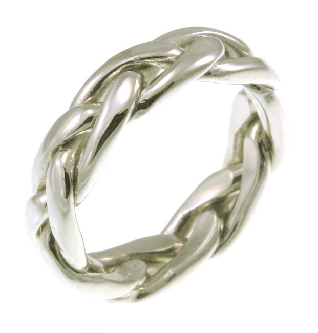 18Kt white gold hand made open braided, approximately 6.0 mm wide, Celtic wedding ring. The ring is polished. Different finishes may be selected or specified. This item can not be engraved.