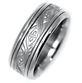 Hand crafted, 14K white gold, 8.0 mm wide comfort fit Celtic wedding band. Hand crafted with beautiful motifs. The center is matte and the rest is polished. Different finishes may be selected.