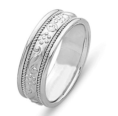 Hand crafted, 14 kt white gold comfort fit band. Twisted white gold wires and beautiful motifs crafted in the white gold. The center is matte and the rest is polished. Different finishes may be selected or specified.