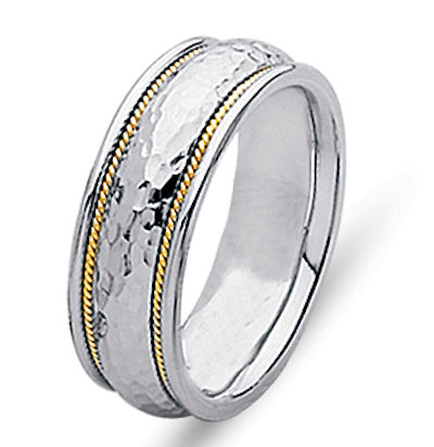 18 kt yellow gold and platinum hand crafted, 6.0 mm wide, comfort fit wedding band. The ring is high dome with the center hammered finish and two twisted ropes made in 18 kt yellow gold. The ring is polished. Different finishes may be selected or specified.