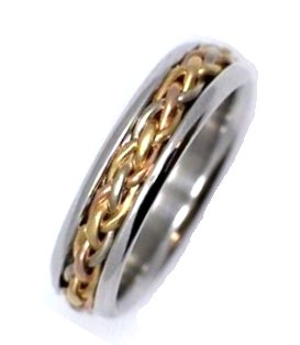 Hand crafted, platinum and 18 kt yellow gold comfort fit band, 6.0 mm wide wedding ring. There is a hand made braid in the center. The whole ring is polished. Different finishes may be selected or specified.