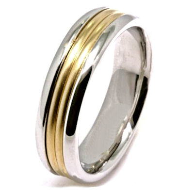 18 kt yellow gold and Platinum, hand crafted wedding band. The center of the ring is a matte finish and the outer edges are polished. Different finishes may be selected or specified.