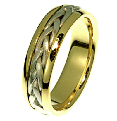 Hand crafted, 18 kt two-tone gold comfort fit band. The braid is beautifully crafted in 18k white gold. The ring is 6.5 mm wide. The center is matte and the outer edges are polished. Different finish may be selected or specified.