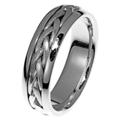 Hand crafted, platinum comfort fit band. The braid is beautifully crafted in platinum. The ring is 6.5 mm wide. The center is matte and the outer edges are polished. Different finish may be selected or specified.