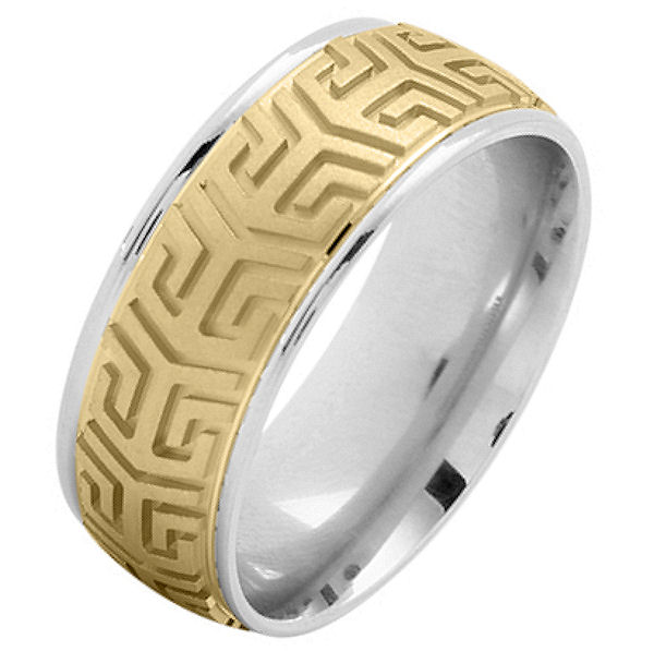 18 Kt two-tone gold, comfort fit, 8.0 mm wide, carved wedding band. The center of the ring has a carved pattern in yellow gold and is brushed finish. The outer edges are white gold and polished. Other finishes may be selected or specified.