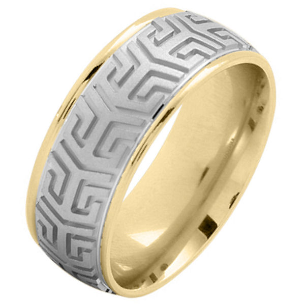 14 Kt two-tone gold, comfort fit, 8.0 mm wide, carved wedding ring. The center of the ring has a carved pattern in white gold and brushed finish. The outer edges are yellow gold and polished. Other finishes may be selected or specified.