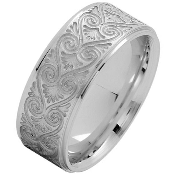 14 Kt White gold, comfort fit, 8.5 mm wide, carved wedding ring. The ring has a carved pattern in the center that is brush finish. Outer edges are polished. Other finishes may be selected or specified.