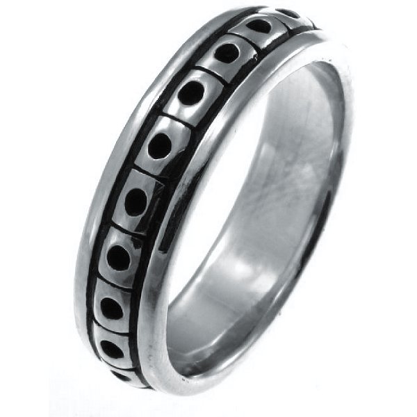 Hand crafted, 14K white gold, Black Antique, 5.0 mm wide comfort fit Celtic wedding band. The finish is polished. Different finishes may be selected or specified.