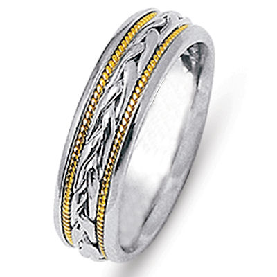 14 kt two-tone hand crafted 6.0 mm wide comfort fit wedding band. The ring has two 14 kt yellow gold ropes and a beautiful braid made in 14 kt white gold. The finish is all polished. Different finishes may be selected or specified.