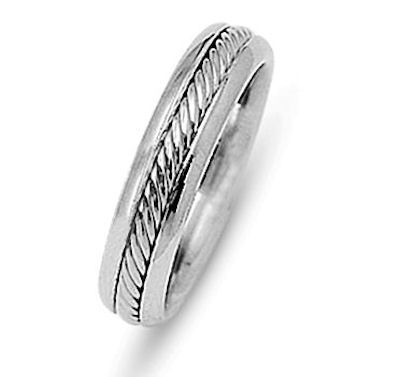 Platinum 5.5 mm wide comfort fit hand made wedding band. The rope is beautifully crafted in platinum. The finish on the ring is polished. Different finishes may be selected or specified.