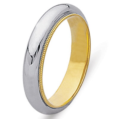 Hand crafted 14 kt two-tone gold, 5.0 mm wide comfort fit wedding band. The ring has milligrain edges and a polished finish. Different finishes may be selected or specified.