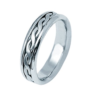 14Kt White gold hand braided wedding band. This band is approximately 5.0 mm wide and comfort fit. The braid in the center is hand made. The finish is polished. Different finishes may be selected or specified.
