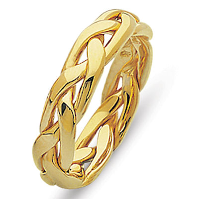 Hand woven 14 kt yellow gold comfort fit, 5.0 mm wide wedding band. The ring is made with a polished finish. Different finishes may be selected or specified.