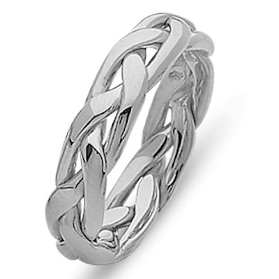 Hand woven 14 kt white gold comfort fit, 5.0 mm wide wedding band. The ring is made with a polished finish. The ring is made with a polished finish. Different finishes may be selected or specified.