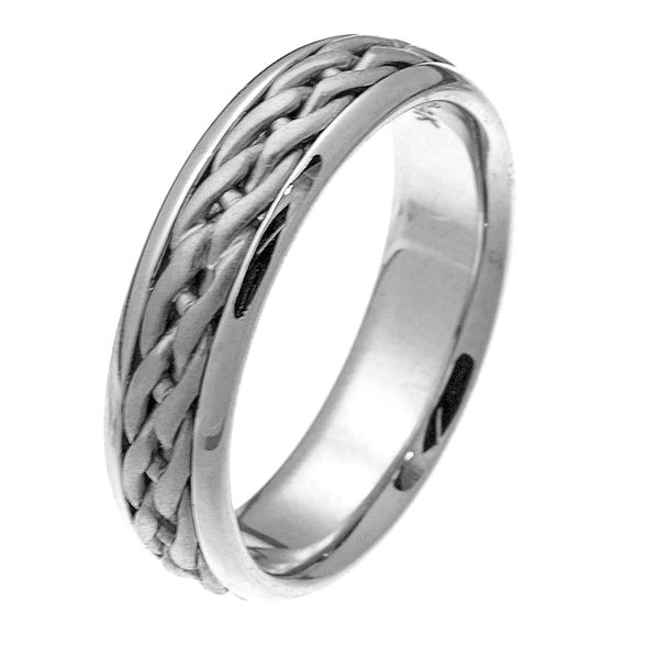 14 kt white gold hand crafted 6.0 mm wide comfort fit wedding band. The ring has a beautiful braid made from white gold in the center that has a sandblast finish and the edges are polished. It is 6.0 mm wide and comfort fit. Different finishes may be selected or specified.