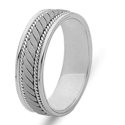 Hand crafted 18 kt white gold 6.0 mm wide, comfort fit wedding band. The ring has a sandblast finish in the center and the rest is polished. Different finishes may be selected or specified.