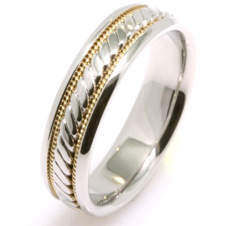 14 K two tone , white and yellow gold, 6.0 mm wide comfort fit, hand crafted wedding band. The brushed center is a hand made design with one hand crafted rope on each side of the design with the rest of the band polished. Different finishes may be selected or specified.
