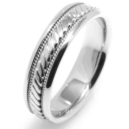 Platinum, 6.0 mm wide comfort fit, hand crafted wedding band. The brushed center is a hand made design with one hand crafted rope on each side of the design with the rest of the band polished. Different finishes may be selected or specified.