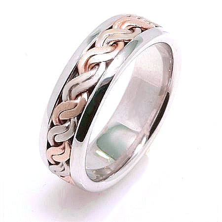 18 K white and rose gold, comfort fit, 7.0 mm wide, hand made wedding band. There is a hand crafted braided rope in the center. The finish in the center is matte and the outer edges are polished. Different finishes may be selected or specified.