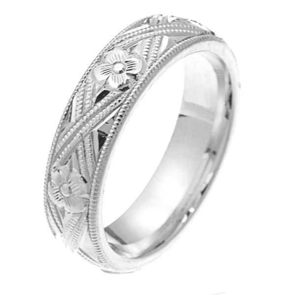 Platinum hand carved comfort fit 5.0 mm wide wedding band. The white gold is hand carved with milgrains and flowers. It is 5.0 mm wide and a polished finish. Different finishes may be selected or specified.