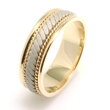 18 K two tone, white and yellow gold, comfort fit, 7.0 mm wide, hand crafted wedding band. There is a hand made rope design in the center with one hand crafted rope on each side of the design. The finish in the center is a sandblasted matte and the outer edges are polished. Different finishes may be selected or specified.