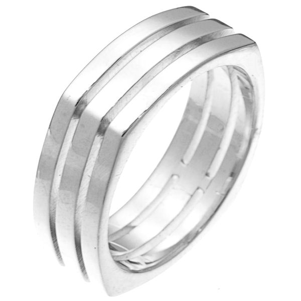 Platinum square comfort fit 7.5 mm wide wedding band. The ring has 3 square shaped rings welded together to create a beautiful contemporary style. It is a polished finish and 7.5 mm wide. Different finishes may be selected or specified.