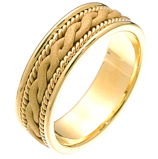 14 kt yellow gold hand braided comfort fit 7.0 mm wide wedding band. The ring has a yellow gold braid that has a sandblasted finish and one rope on each side of the braid. It is 7.0 mm wide and comfort fit. Different finishes may be selected or specified.