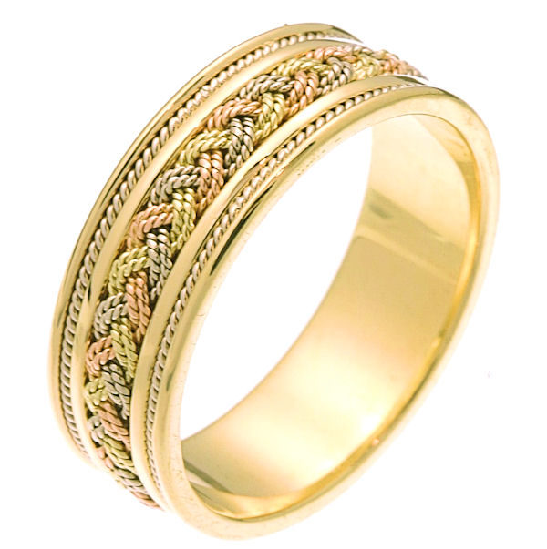 18 kt tri-color hand braided comfort fit 7.0 mm wide wedding band. The ring has two 18 kt tri-color ropes braided together in the center and one white gold rope on each side of the braid. It is 7.0 mm wide and comfort fit. The finish is polished. Different finishes may be selected or specified.