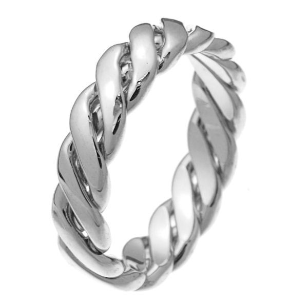18 kt white gold hand crafted 5.0 mm wide comfort fit wedding band. The ring is made with two beautifully intertwined white gold pieces. It is 5.0 mm wide and comfort fit. The finish is polished. Different finishes may be selected or specified.