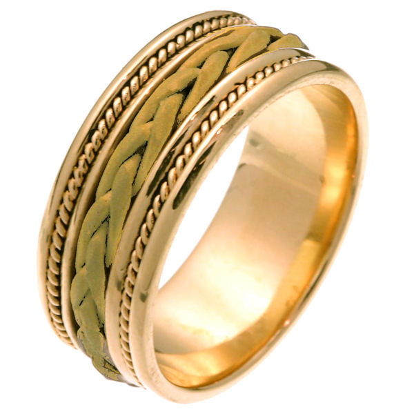 14 kt yellow gold hand braided 8.5 mm wide comfort fit wedding band. The ring has a sandblasted finish braid in the center with one rope on each side of the braid. The rest of the band is polished finish. It is 8.5 mm wide and comfort fit. Different finishes may be selected or specified.