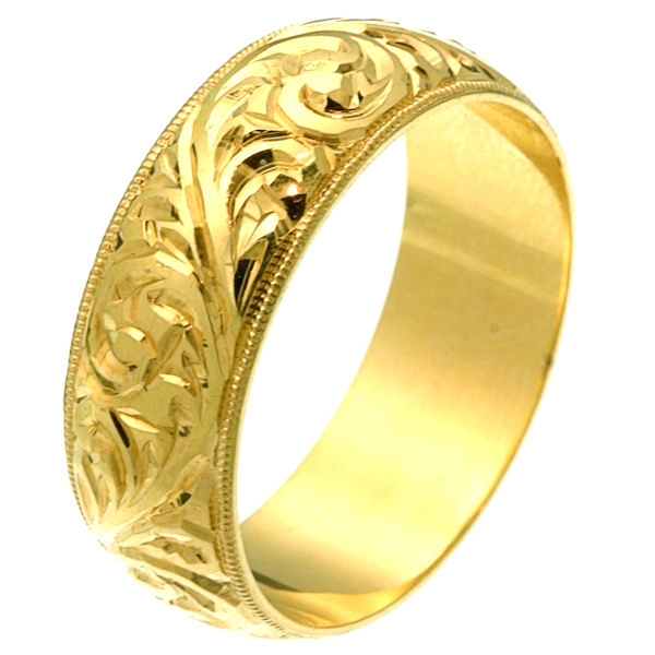 18 kt yellow gold hand carved comfort fit 8.0 mm wedding band. The yellow gold is hand carved with beautiful motifs with milgrain edges. It is 8.0 mm wide and comfort fit. The finish is polished. Different finishes may be selected or specified.