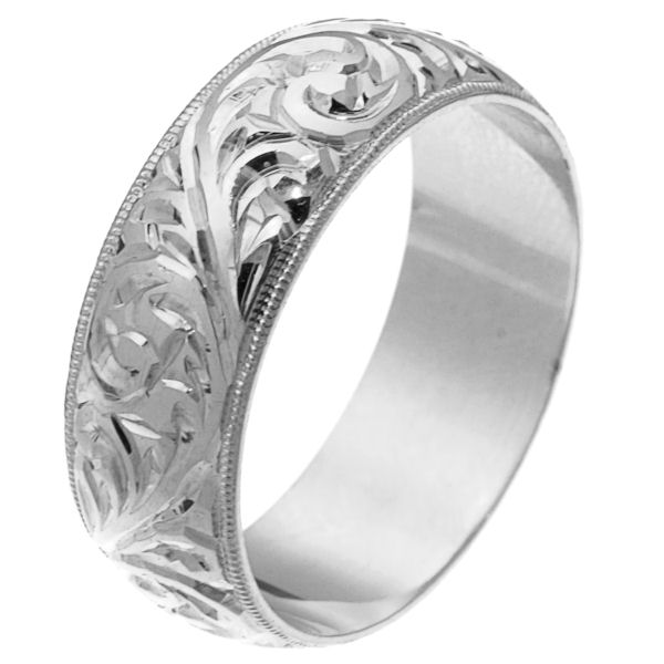 18 kt white gold hand carved comfort fit 8.0 mm wedding band. The white gold is hand carved with beautiful motifs with milgrain edges. It is 8.0 mm wide and comfort fit. The finish is polished. Different finishes may be selected or specified.