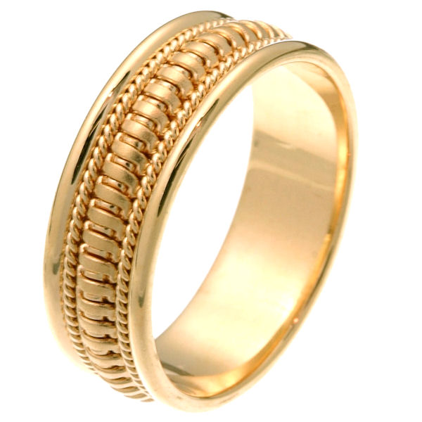 14 kt yellow gold hand crafted 7.5 mm comfort fit wedding ring. The ring has beautiful crafted gold waves in the center of the band that is matte finish and one rope on each side with a polished finish. It is 7.5 mm wide and comfort fit. Different finishes may be selected or specified.