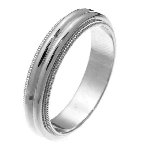 14 kt white gold 5.0 mm wide comfort fit wedding ring. The band has two domes in the center and milgrain edges. It is all polished and 5.0 mm wide. Different finishes may be selected or specified.