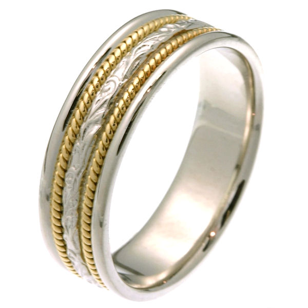 Platinum and 18 kt yellow gold hand carved 6.0 mm wide comfort fit wedding band. The ring is hand carved in the center and one rope lies on each side of the carved portion. It is 6.0 mm wide and comfort fit. The finish in the center is matte and the outer edges are polished. Different finishes may be selected or specified.