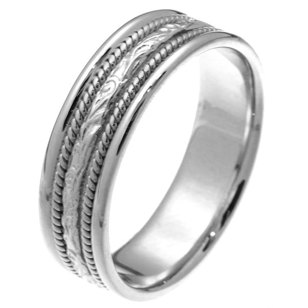 18 kt white gold hand carved 6.0 mm wide comfort fit wedding band. The ring is hand carved in the center and one rope lies on each side of the carved portion. It is 6.0 mm wide and comfort fit. The finish in the center is matte and the outer edges are polished. Different finishes may be selected or specified.