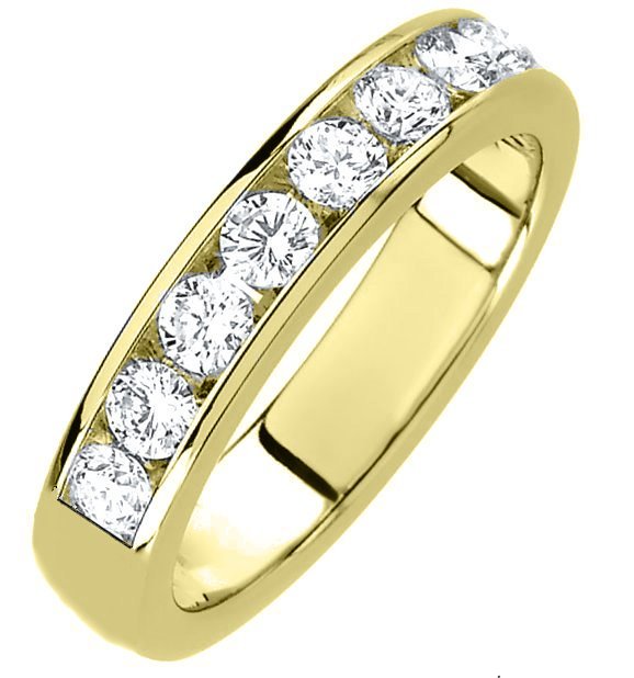 14K yellow gold, diamond band. The 4.0 mm wide band set in channel holds 9 diamonds with total weight of approximately 1.0 ct. The diamonds are graded as VS in clarity G-H in color. The finish is polished. Different finishes may be selected or specified.