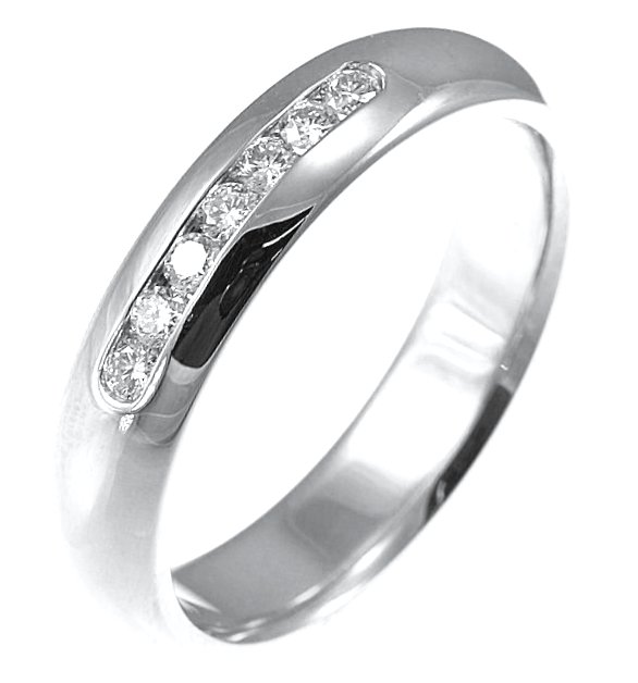 18kt white gold, 5.0 mm wide, comfort fit diamond wedding band. Diamonds total weight is 0.25 ct and are graded as VS in clarity G-H in color. The finish is polished. Different finishes may be selected or specified.