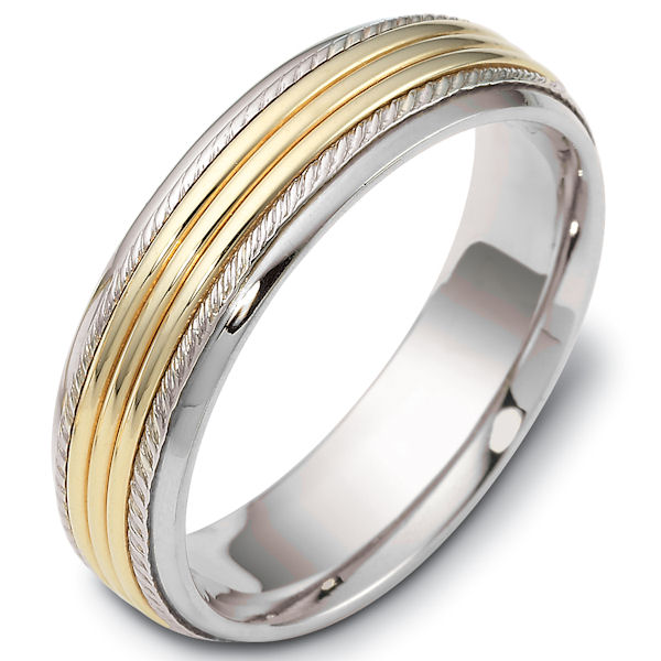 18kt Two-tone gold classic, comfort fit, 6.0mm wide wedding band. The ring has carvings near the edges. It has a polished finish. Different finishes may be selected.