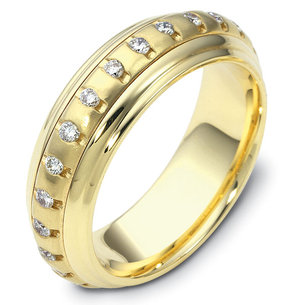 18kt Yellow gold diamond spinning, eternity, comfort fit, 6.5mm wide wedding band. The ring has 0.50 ct tw diamonds that are VS1-2 in clarity and G-H in color. There are 25 round brilliant cut diamonds, each measures 0.02 ct. The center portion of the ring has a matte finish and the edges are polished. Different finishes may be selected or specified.