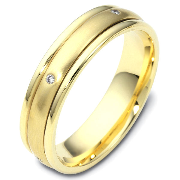 14kt Yellow gold spinning diamond, comfort fit, 4.0mm wide wedding band. The ring has 0.05 ct tw diamonds that are VS1-2 in clarity and G-H in color. There are 5 round brilliant cut diamonds, each measures 0.01 ct. The center of the band rotates and has a matte finish. The edges are polished. Different finishes may be selected or specified.